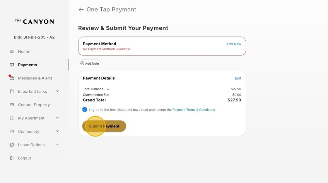 The resident clicks the checkbox stating "I agree to the fees listed and have read and accept the Payment Terms & Conditions".