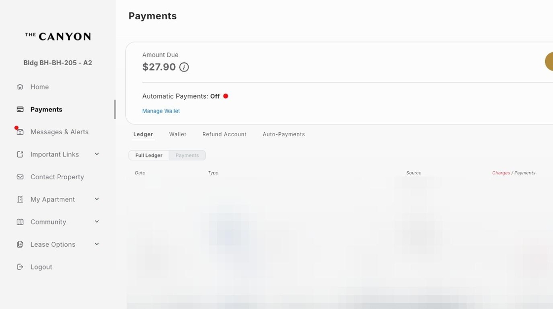 1. Resident will navigate to their ResidentPortal -> Payments tab.
